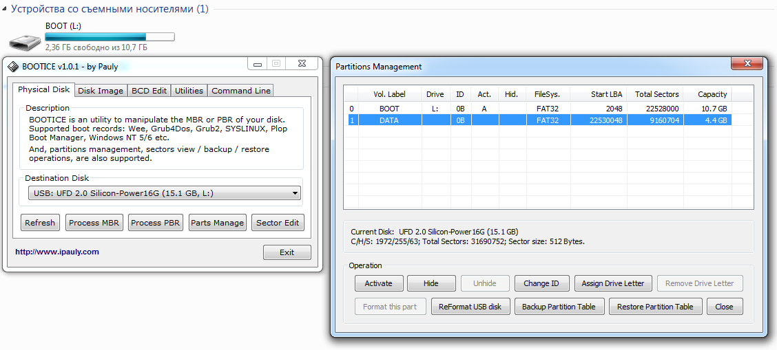 Сегодня обнаржил, что в новой версии BOOTICE v2012.12.05(v1.0.1) автор максимально упростил работу с несколькоми разделами.